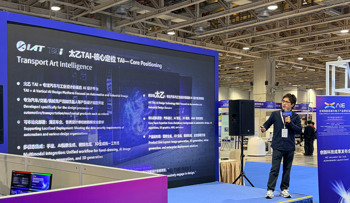 At the event, IAT Auto impressed the audience with the upgraded "TAI." As the industry's first professional-grade AI productivity tool focused specifically on automotive styling design, "TAI" is trained on professional automotive design data and engineering knowledge accumulated by IAT over more than two decades. It integrates core functions such as creative exploration, rapid rendering, multi-view generation, and intelligent optimization. At the AIE Innovation Achievements Release Conference, Tan Jing, Head of the AI & Visual Effects Department at IAT Styling Research Institute, delivered a keynote presentation, introducing the product advantages and functional upgrades of "TAI" to global clients for the first time.